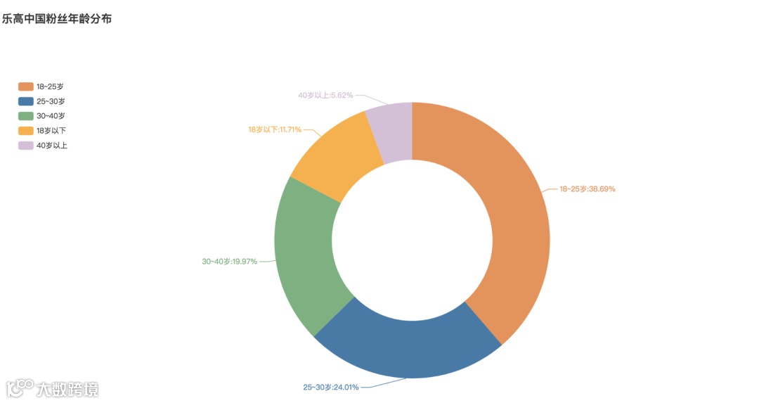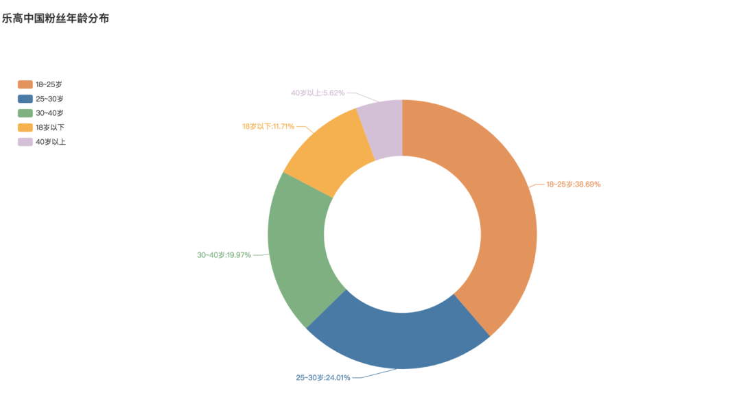 18-25岁的粉丝最多占比高达38.69%,其次就是25-30岁的了,占比为24.01%,30-40岁的占比19.97%。总体来说,乐高在国内的粉丝还是比较年轻化的,既有喜欢玩乐高的年轻玩家,也有热衷给孩子买乐高玩的年轻父母。