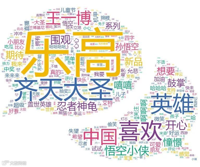 下面我们看到“乐高中国”微博下面的评论词云,可以看到提到最多的就是"乐高"。同时"齐天大圣"、"忍者神龟"等都是被提及最多的热门款。