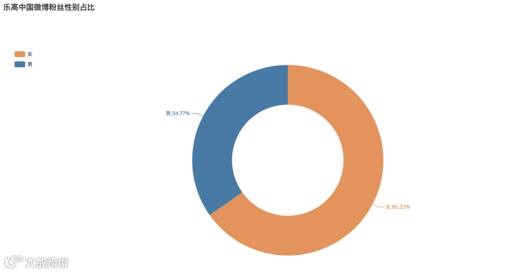 首先看到乐高中国的微博粉丝性别占比,从数据可以看到,女性粉丝远超男性,占比高达到65.23%,男性占比34.77%