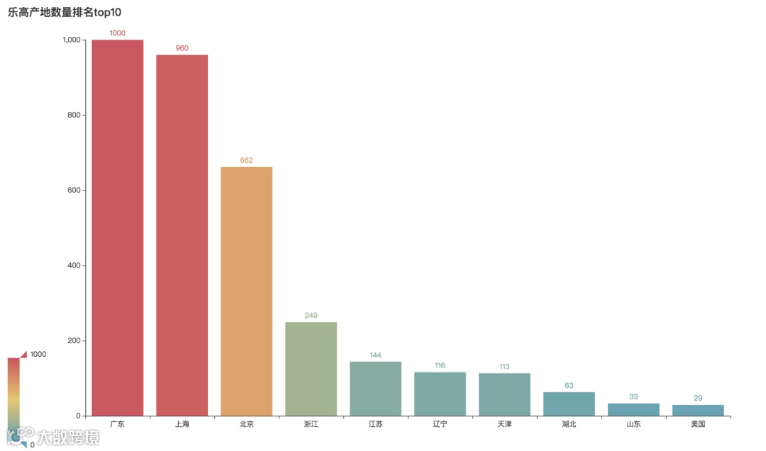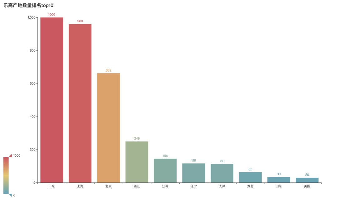 乐高产地方面,我们可以看到,广东和上海是大头,位居第一和第二。北京位居第三。