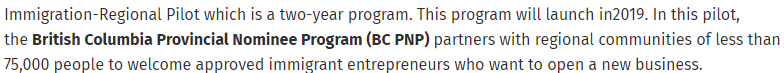 BC省将于2019年年初实行一项名为“企业移民——区域试行计划”