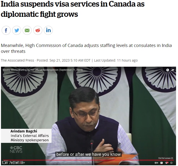 印度外交部发言人Arindam Bagchi称:“我们在加拿大的高级专员公署和领事馆正面临未指明的安全威胁。