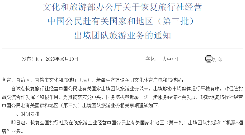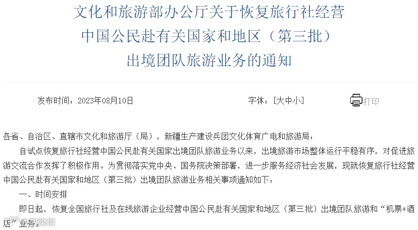 8月10日,文化和旅游部发布了《关于恢复旅行社经营中国公民赴有关国家和地区(第三批)出境团队旅游业务的通知》。