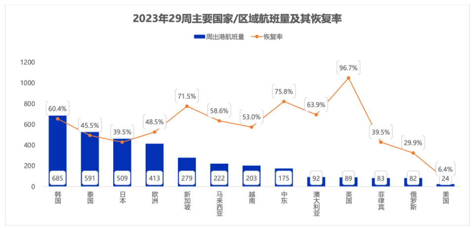 其中,中国-韩国的航班量居于首位,中韩航班恢复率超过六成,而中美航班的恢复率只有6.4%,中欧航班的恢复率也只有48.5%。