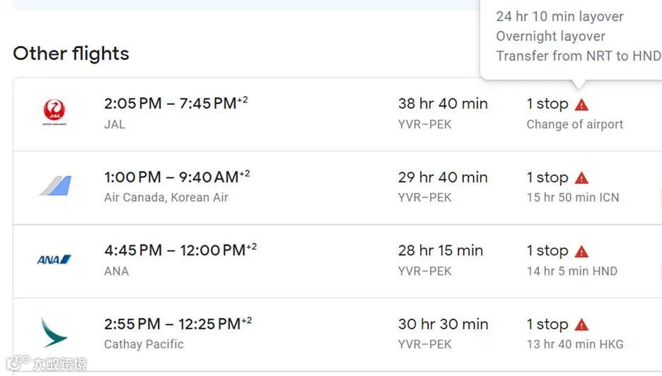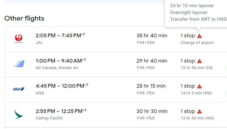 小编手痒,随手查了一下近期往返北京航线(包括中转),光是看整个航程的时间,就感觉“触目惊心”: