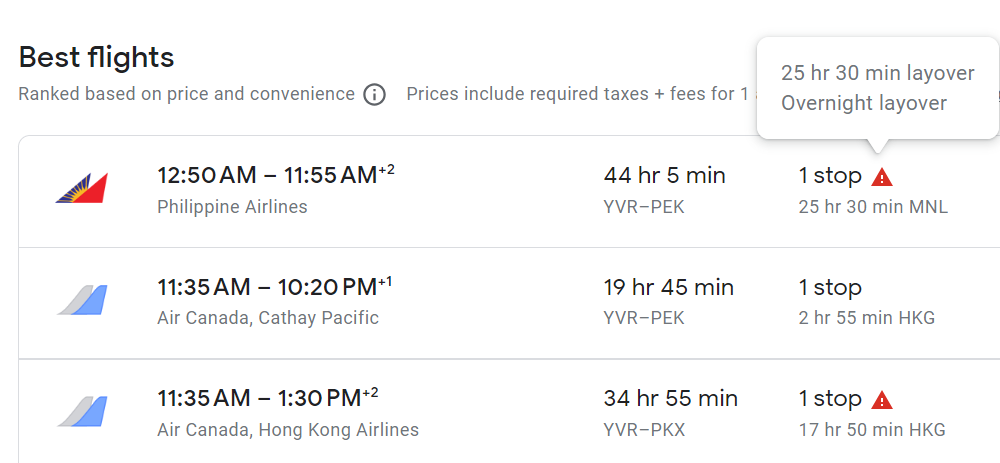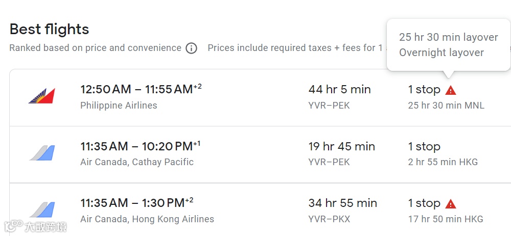 温哥华一个华人妈妈L的路线是这样的:温哥华-马尼拉-北京。