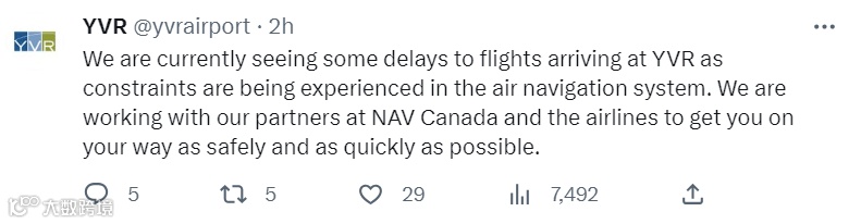 就在旅客们一脸懵然,不知今天又出啥状况时,YVR发出通知:“由于空中导航系统受到限制,目前抵达YVR的航班出现一些延误。我们正在与加拿大国家航空局(NAV Canada)和航空公司的合作伙伴合作,让你尽可能安全、快速地出发。”