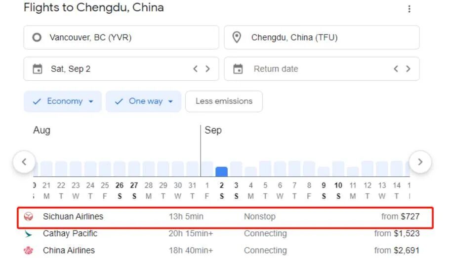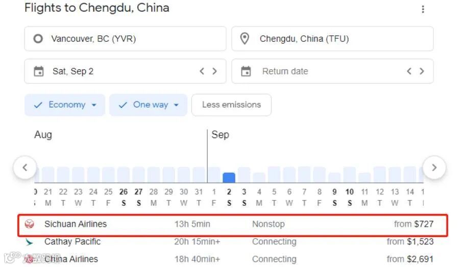 此外,Google Flight显示,温哥华飞成都突然从9月2日起新增一班,虽然目前还查不到航班号,但目测川航将每周两班,分别在周一和六从温哥华出发。价格更是低到了727加元。