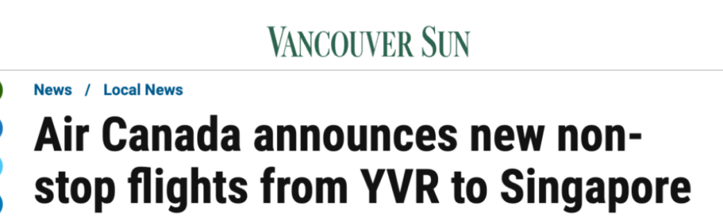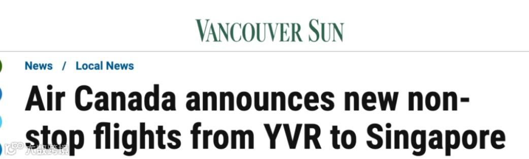 一是最近加航宣布:即将开通温哥华和新加坡往返的直飞航线,每周运行四班。