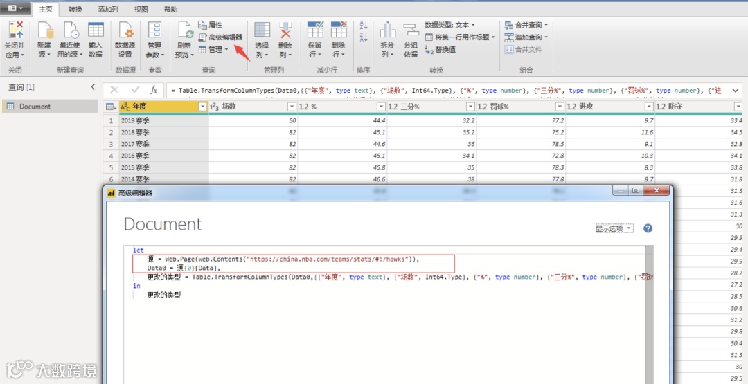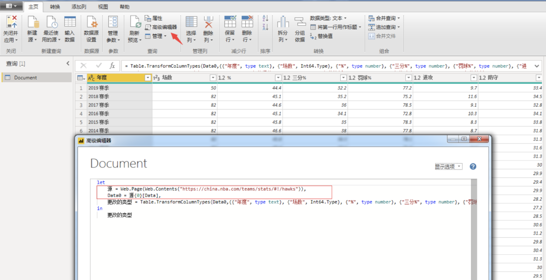 3.编辑查询 点击高级编辑器, 明确获取数据函数