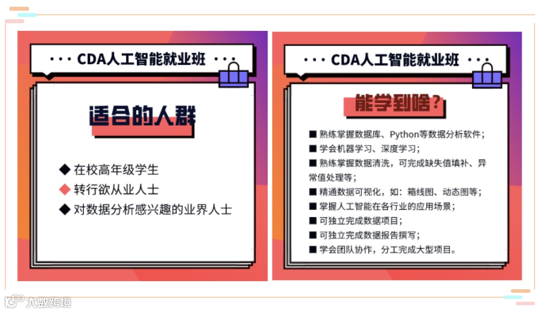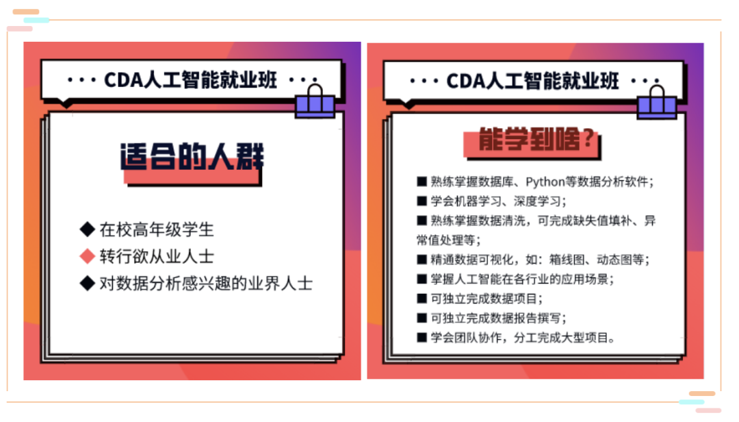 为了更多有志人士实现远大抱负,顺利进入人工智能行业,CDA数据分析师特别针对时间充裕、零基础的专科、本科在校生,以及待业、期待从事数据分析工作的小伙伴们,开设了《CDA人工智能就业班》。