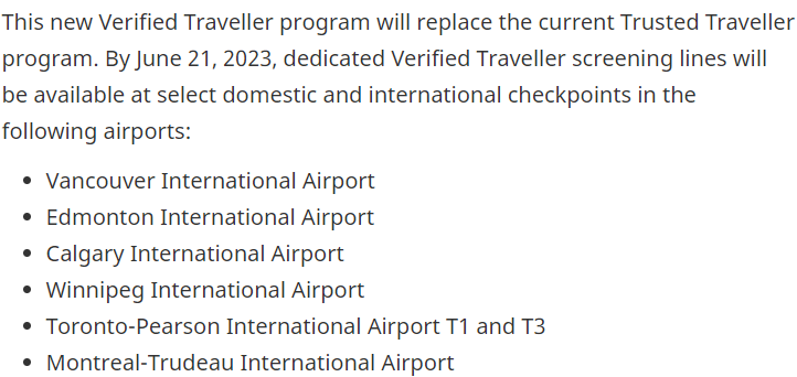 新的快速安检服务将在全国选定的机场提供,包括多伦多-皮尔逊国际机场、温哥华国际机场、埃德蒙顿国际机场、卡尔加里国际机场、温尼伯国际机场和蒙特利尔-特鲁多国际机场。