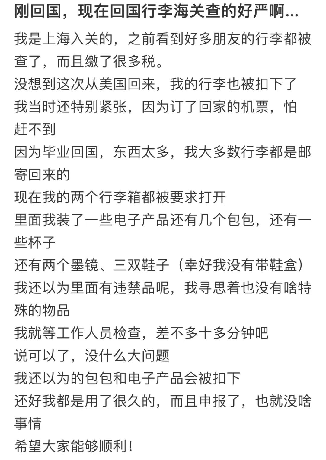 另一位网友则表示,他是上海入关的,之前看到好多朋友的行李都被查了,而且缴了很多税。