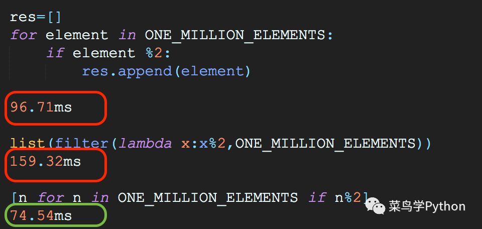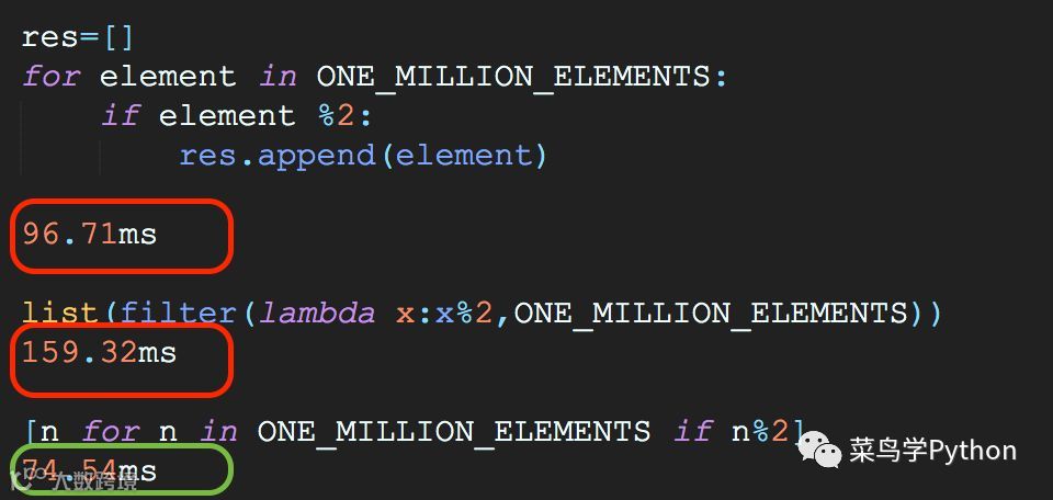 性能:第二种方法比第一种慢近50%,有人可能觉得filter应该会快一些,其实filter增加了复杂度,返回一个迭代对象再用list转化为一个列表,所以开销大一些。其实最快是推导列表,比第一种性能提高近30%。