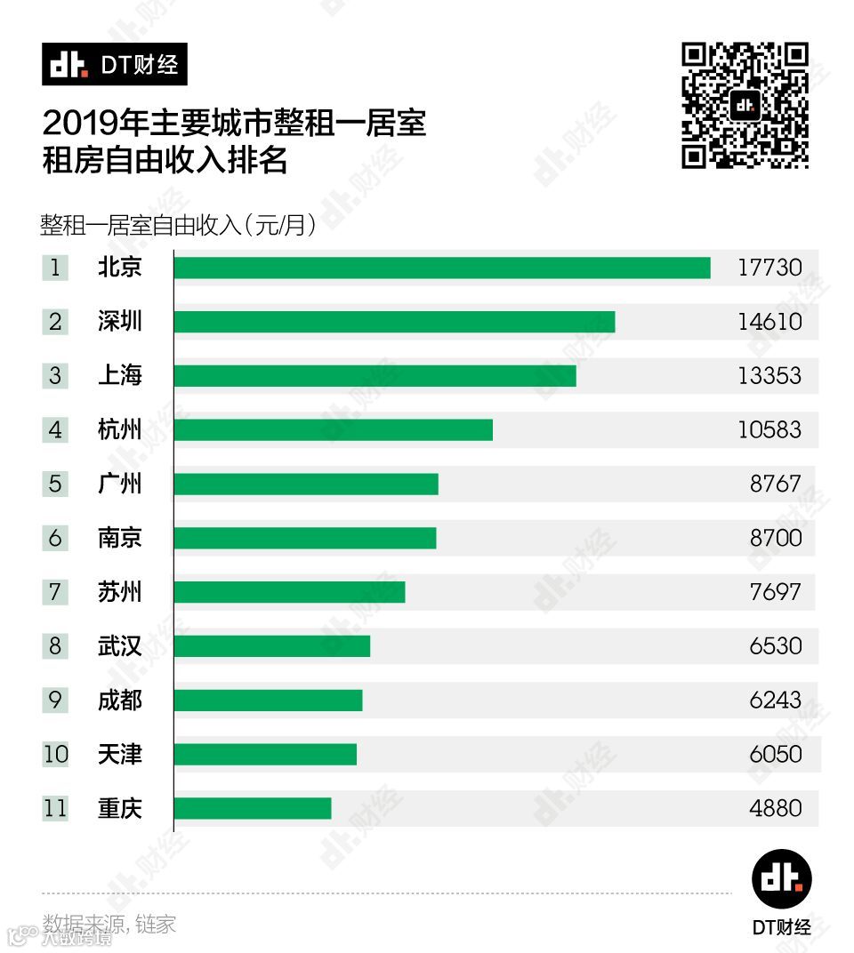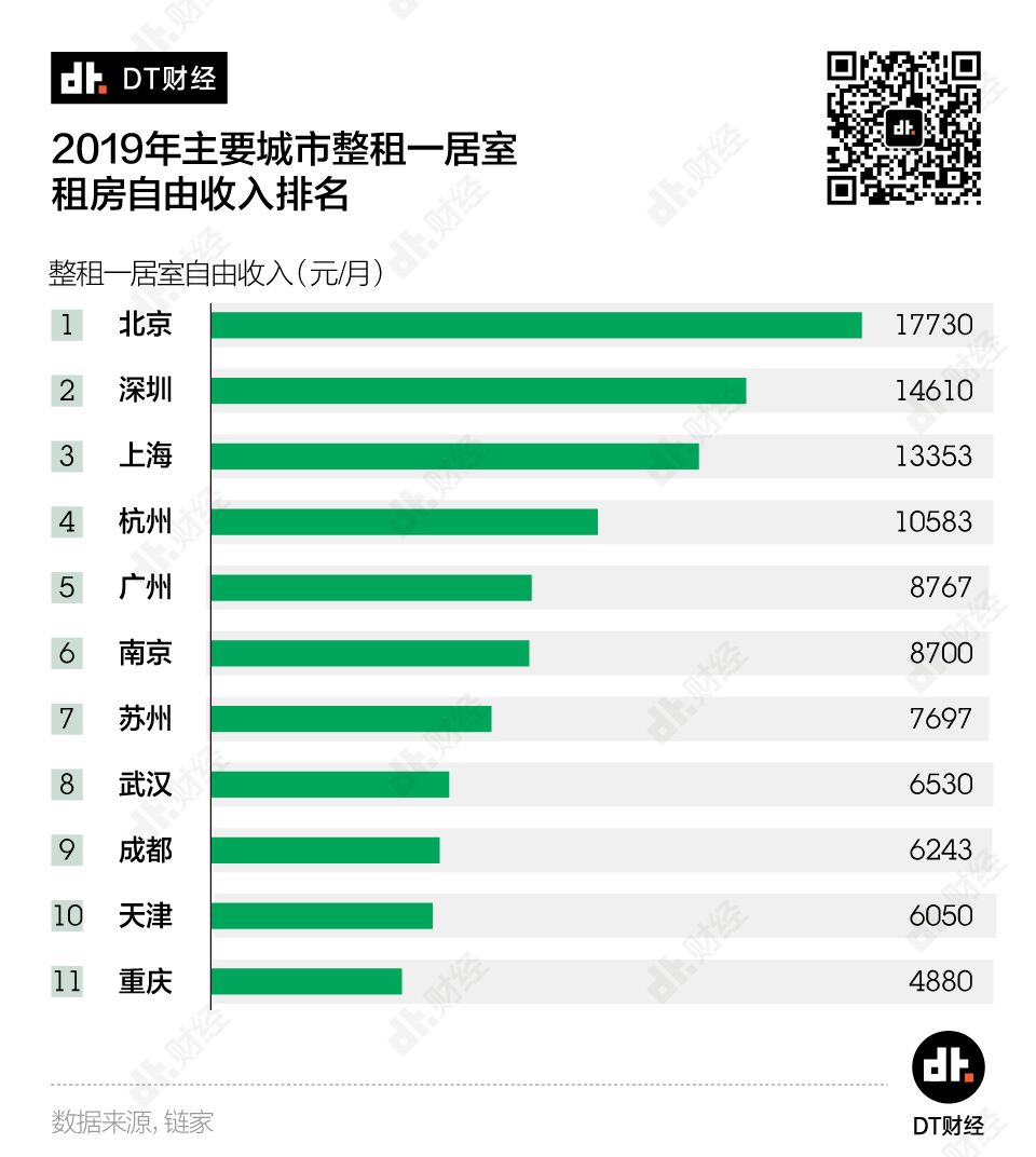 数据显示,北京、深圳和上海的整租一居室租房自由月收入要求最高,分别为1.77万元、1.46万元和1.34万元;杭州的整租自由收入超过了广州,同样需要月入过万。