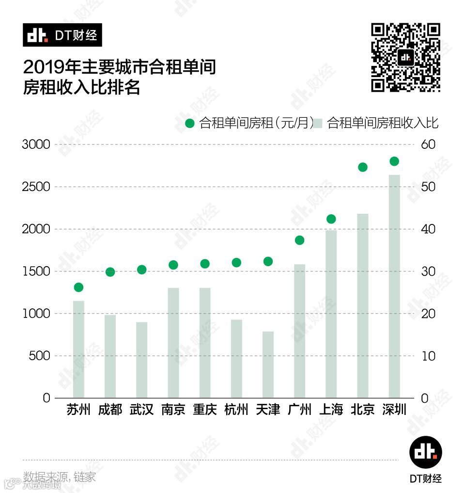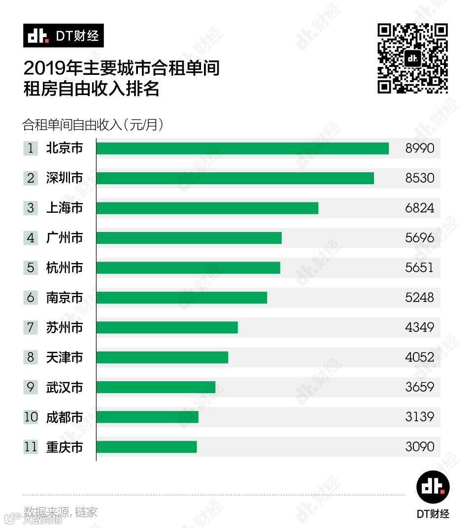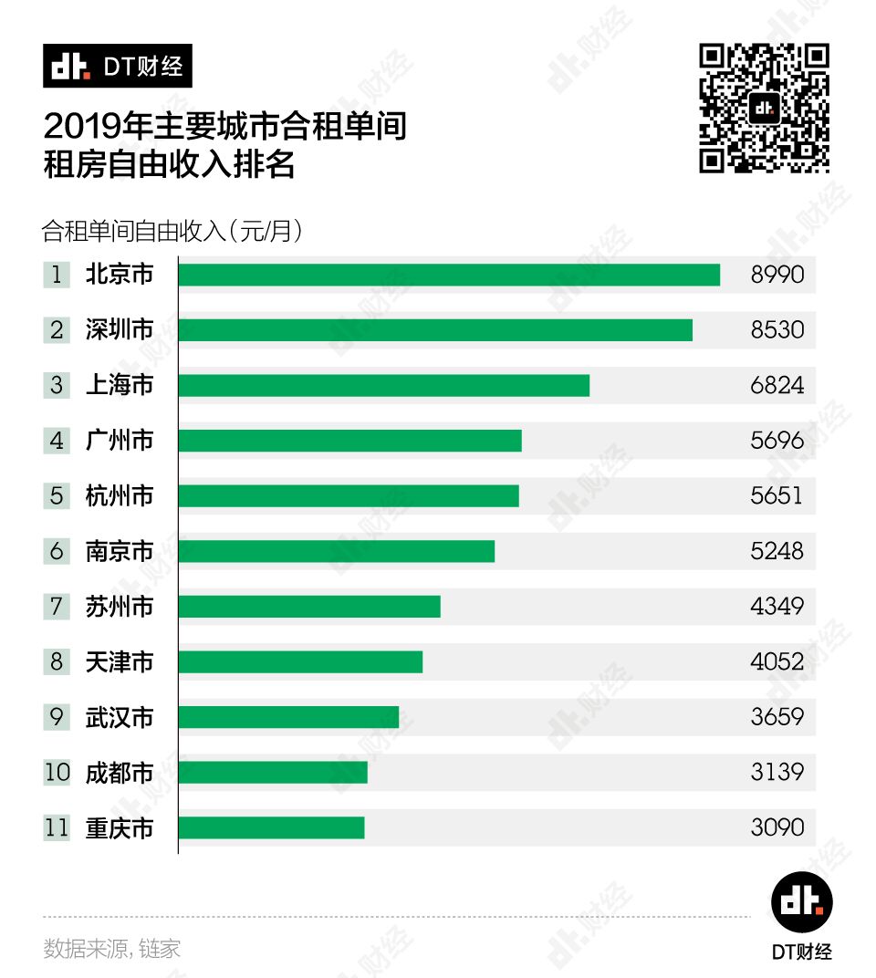 如果选择合租,在北京合租单间的租房自由收入(8990元/月)仅为整租一居室的一半,深圳、上海和广州合租单间的租房自由月收入分别为8530元、6824元以及5696元。可以说,月入5700元就能跨入一线城市合租自由的门槛。
