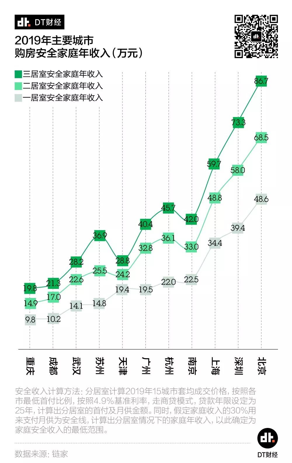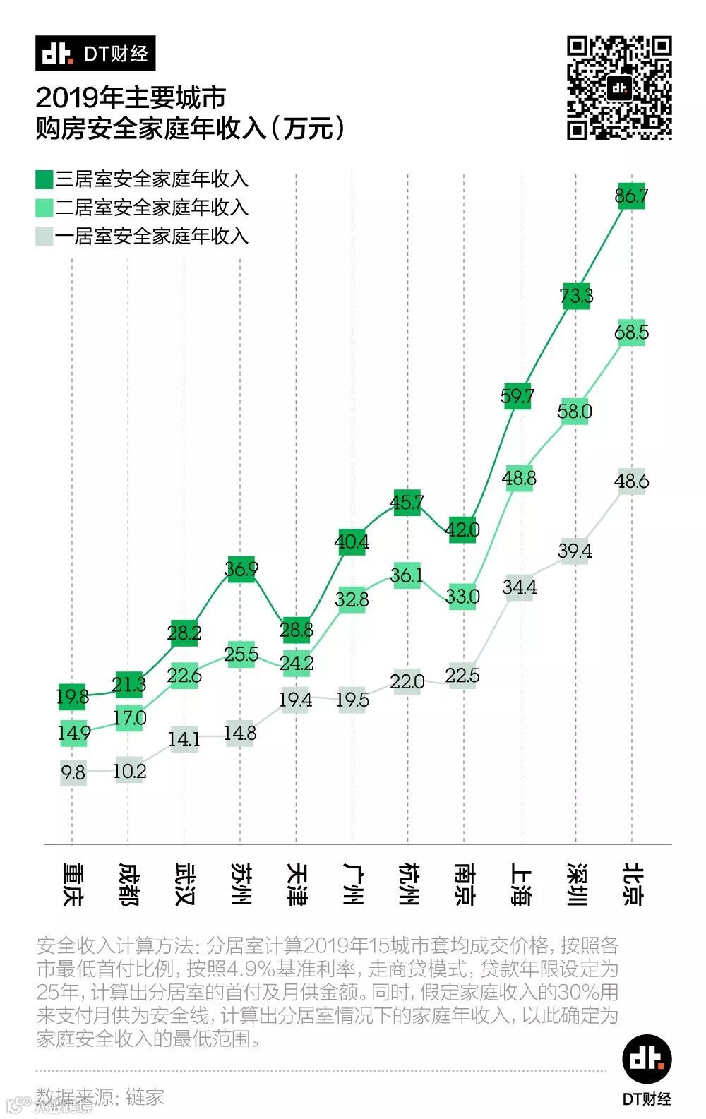 而在二线城市中,南京和杭州的居住成本相对更高,其购房家庭收入门槛甚至要高于广州。
