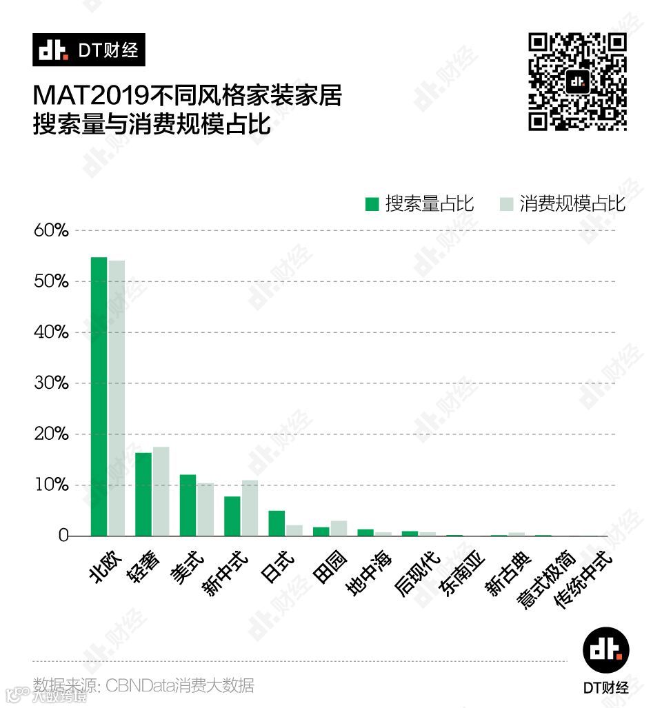 家装家饰、家居用品的风格,代表了青年对家的想象。从MAT2019青年人在电商平台上的搜索量和线上消费规模来看,过半青年人选择了北欧风。北欧风的家装家居风格具有简约实用的特点,其广受欢迎也体现了青年人对于简约实用的广泛推崇。