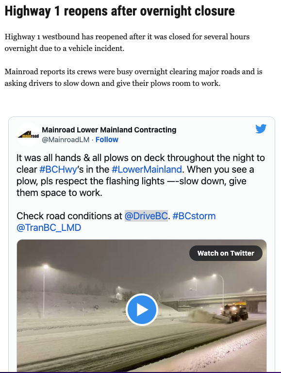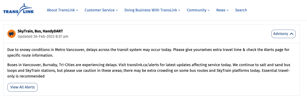 Translink表示,由于大雪的原因,今天的交通系统可能会出现延误,请大家留出额外的时间出行。