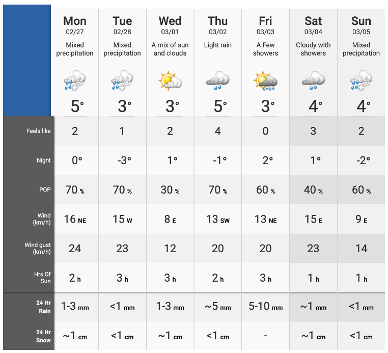 周一和周二(2月27日-2月28日),这团低气压将会穿过低陆平原,大温,以及温哥华岛。
