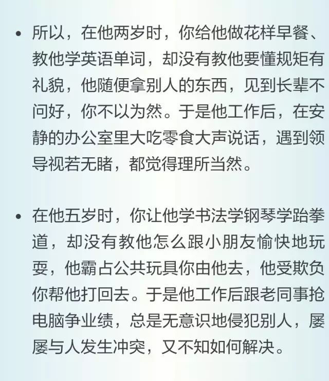 他十岁时,你只关注他有没有考优秀被表扬,却没有告诉他要尊重老师感恩父母,他对长辈大喊大叫,你觉得勇气可嘉,吃饭时别人没落座他就大快朵颐,你觉得他吃饱就好。于是工作后领导夹菜他转桌,领导开门他上车,领导开会他唠嗑,还丝毫意识不到有何不妥。
