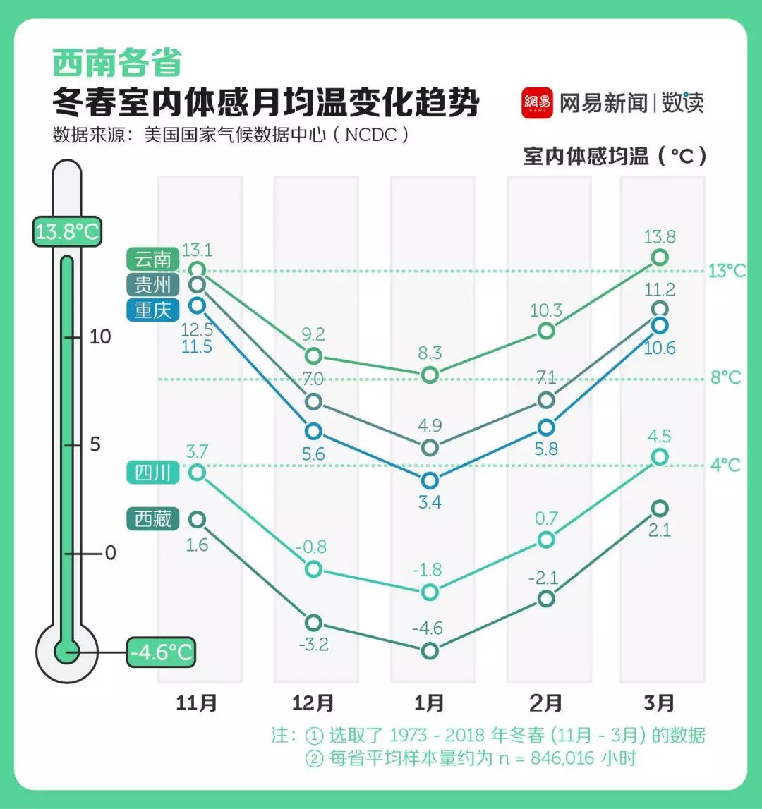 西南地区在室内体感月均温上与华东、华中有较为明显的差异,体感月均温大多数时候低于8℃,为居住其中的市民带来了更多寒意。