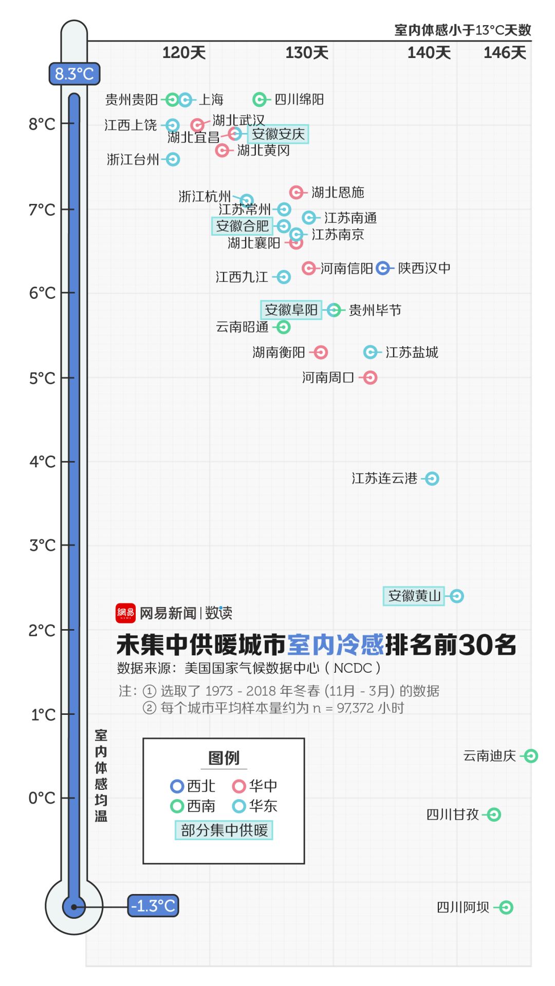 同属高原地带的西藏拉萨室内体感温度也与此相近,只是2019年11月15日起终于开始集中供暖 [2],所以并未出现在本次排名中。