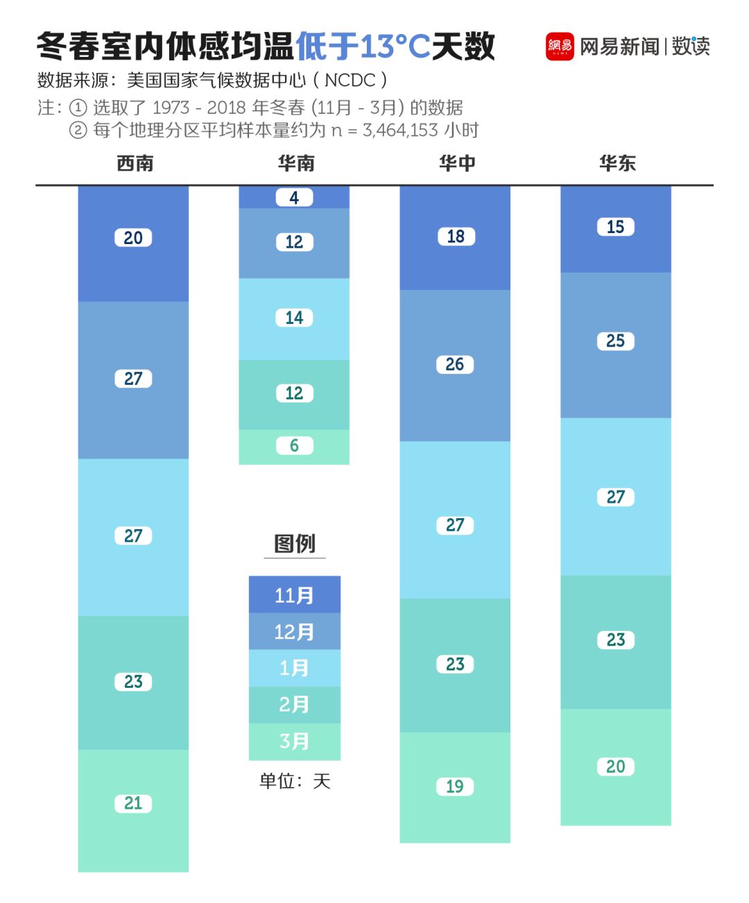 如果以此为衡量标准,华南地区相对而言确实是冬春季节最舒适的地方,最冷的1月份也只有不到半个月室内体感温度低于13℃,和其他地方相比,可以说是相当短的时间了。