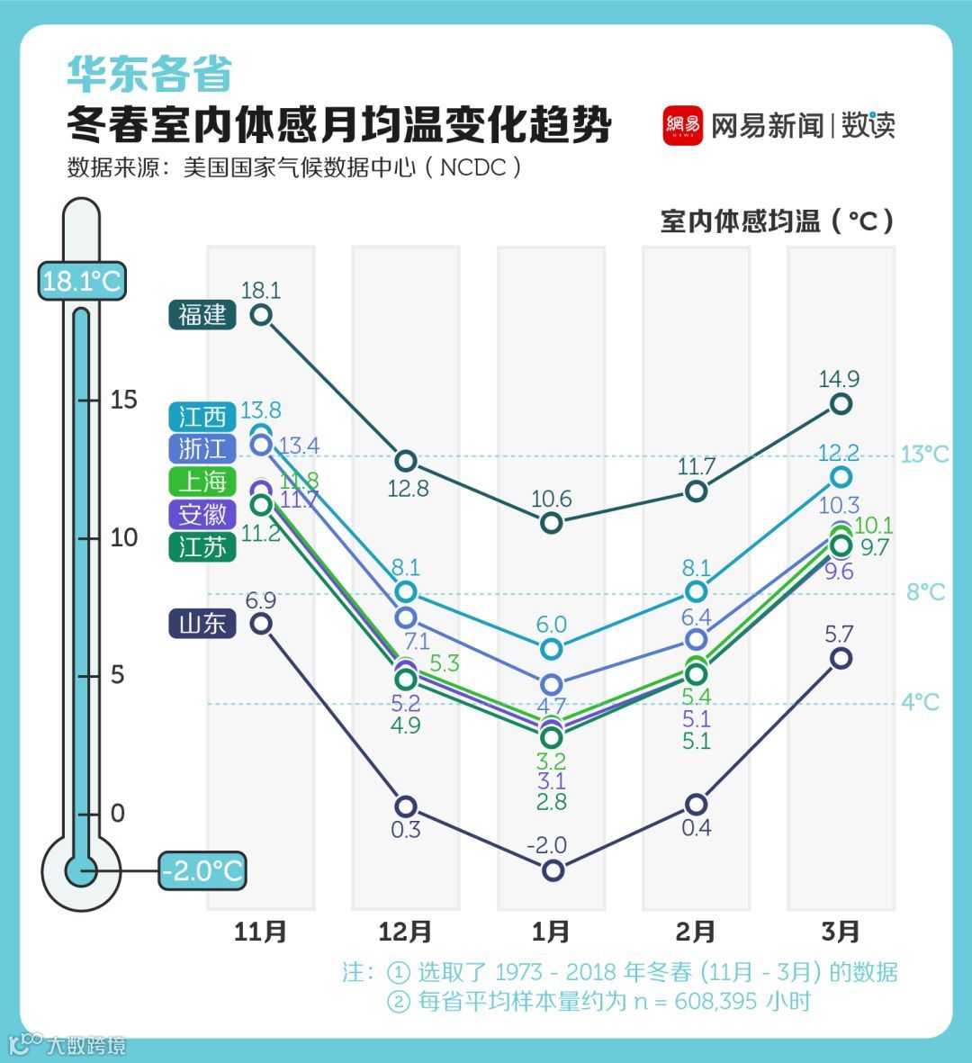 华东作为纬度跨度较大的地理分区,冬春季节各省的体感温度有明显差异。