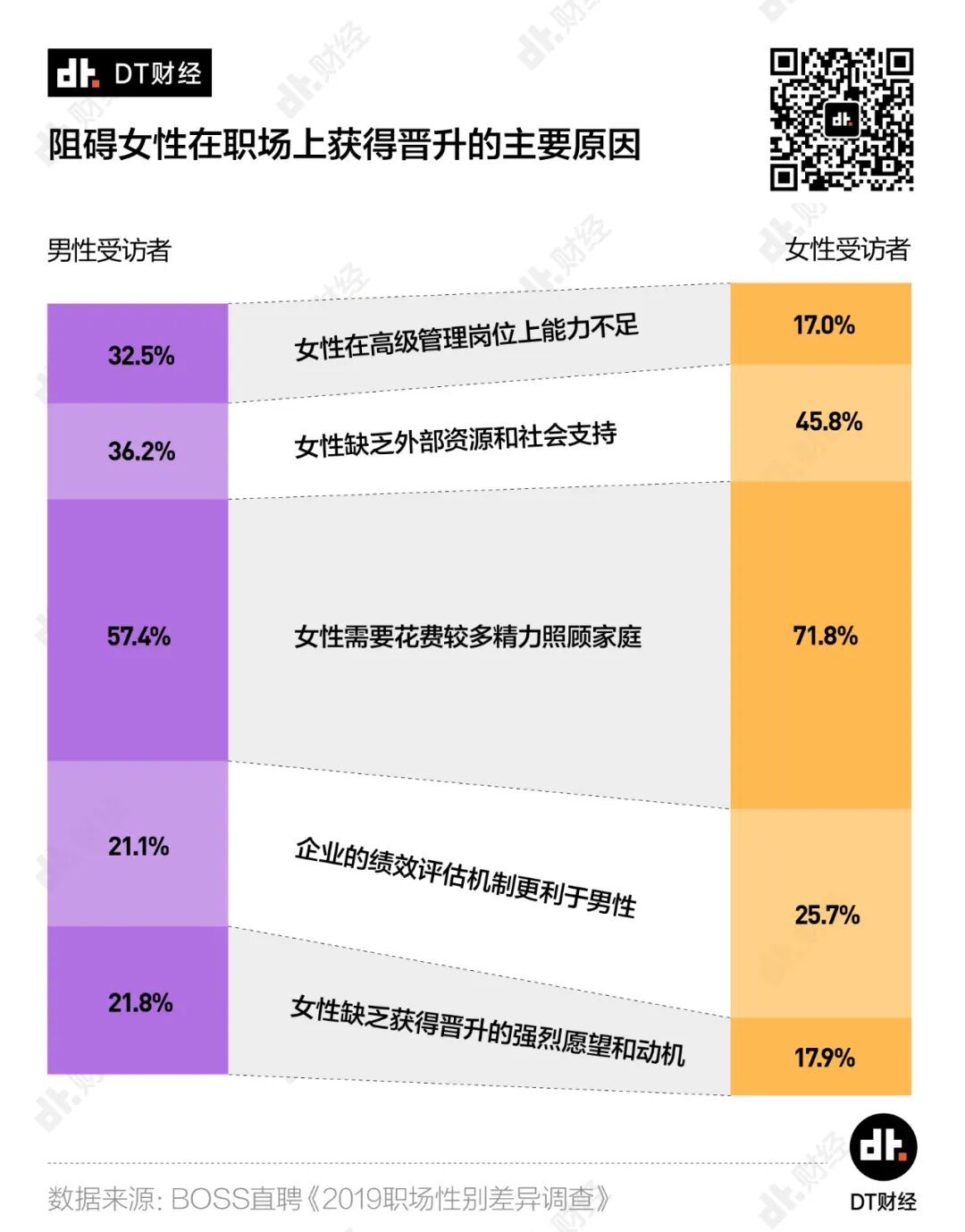 家庭会让女性的职场之路受阻,是大家的共识。我们在文首提到的璐璐便是个典型的例子。调研显示,有近6成男性和超过7成女性认为,“女性需要花更多的精力照顾家庭”是阻碍女性在职场上获得晋升最主要的原因。