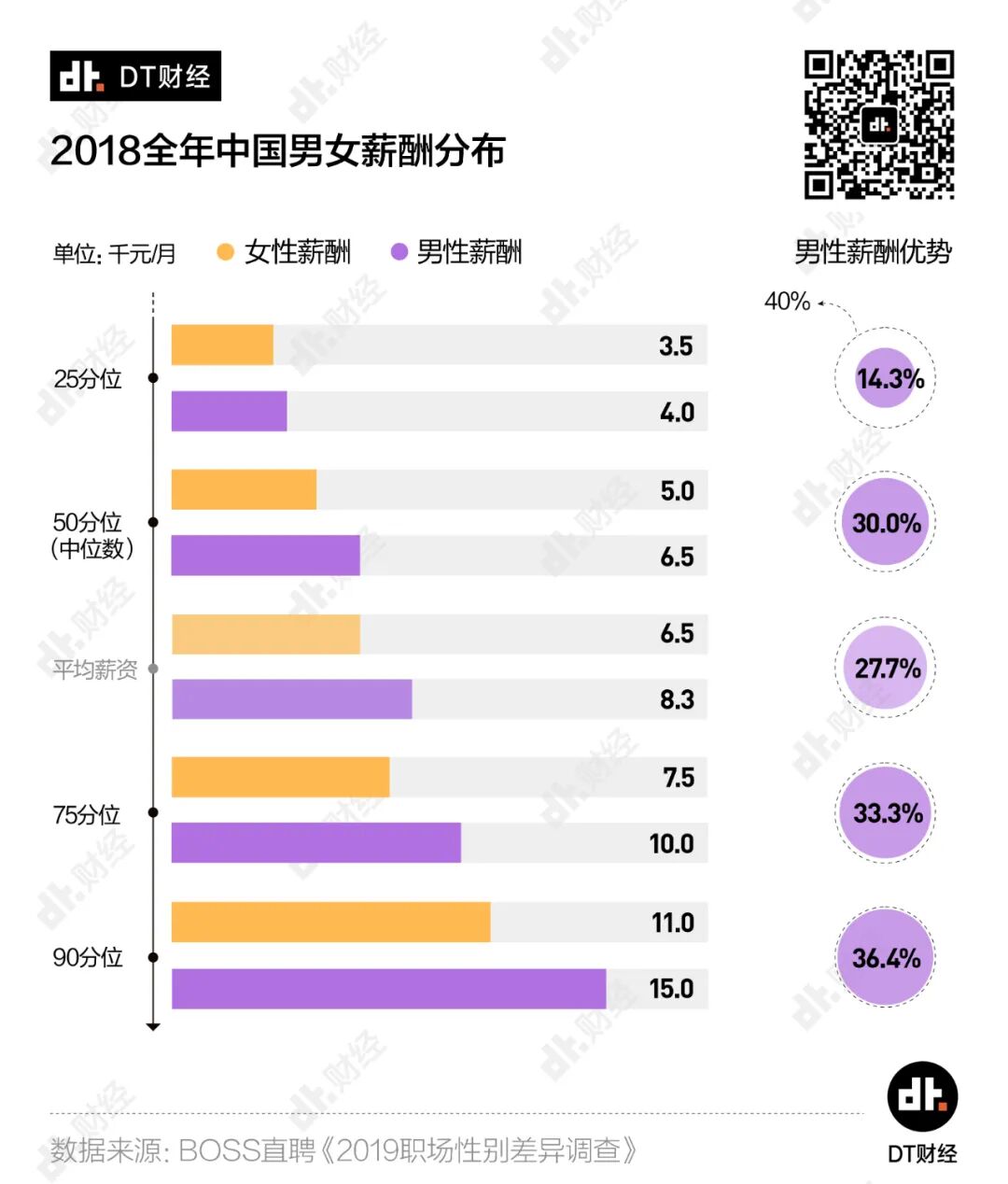 BOSS直聘发布的《2019中国职场性别差异报告》则显示:2018 全年,中国女性平均薪酬为 6497 元/月,男性为8300元/月,男性平均薪酬比女性高出28%。而与2017年相比较,男性的薪酬优势还上升了 8.7 个百分点。