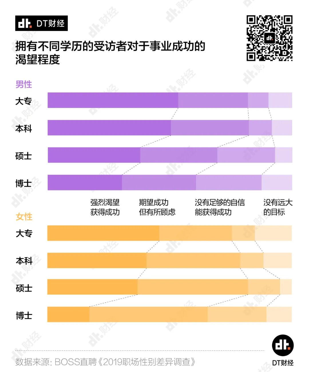 BOSS直聘的调研数据显示,不管身处哪个学历层次,“强烈渴望获得成功”的男性总是多于女性。尽管随着学历的上升,硕士及以上女性对于自身的自信和对成功的渴望开始超过男性,但同时,她们的顾虑也加深了。