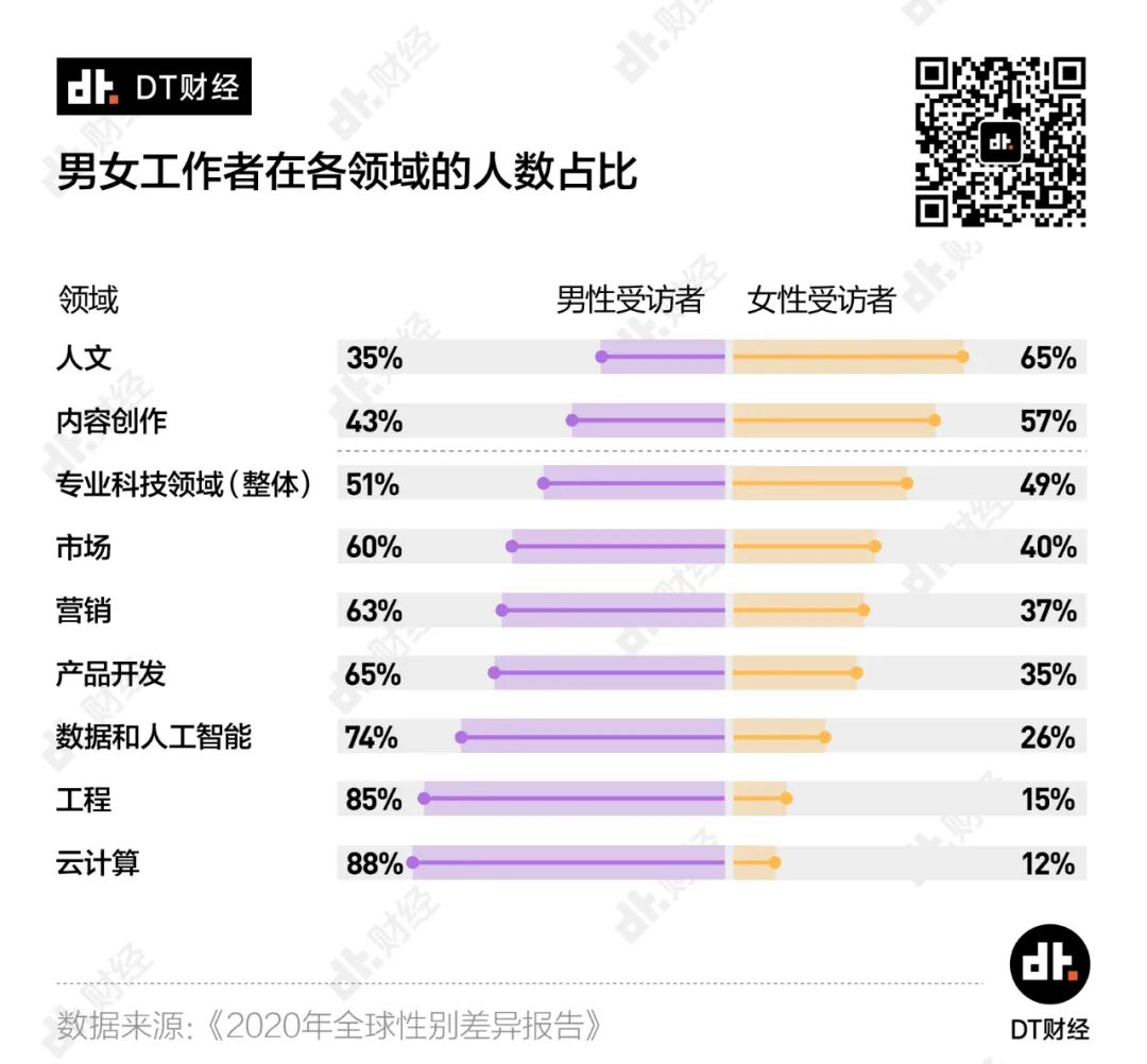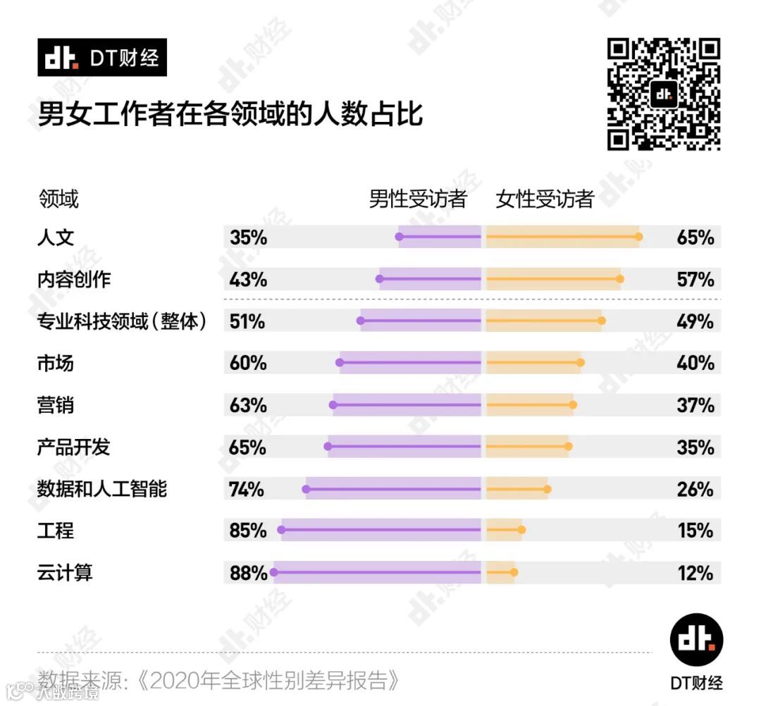 (图片说明:女性在各专业领域的人才与工作者人数比例对比,《2020年全球性别差距报告》)