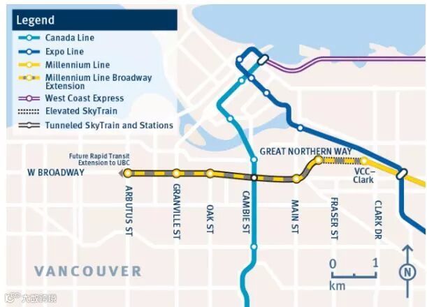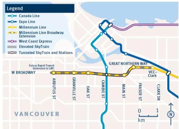 根据项目初期规划,预计建成后,从VCC-Clark Station到 Arbutus Street单程只仅需11分钟,而从Arbutus Street到UBC的延长线全程也仅需10分钟!