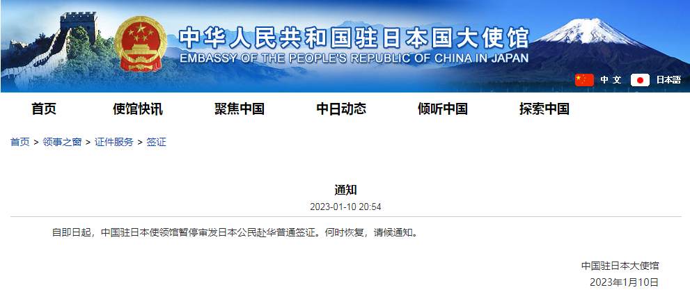 此外,由于日本也对中国旅客区别对待,中国驻日本大使馆也宣布,自1月10日起,中国驻日本使领馆暂停审发日本公民赴华普通签证。