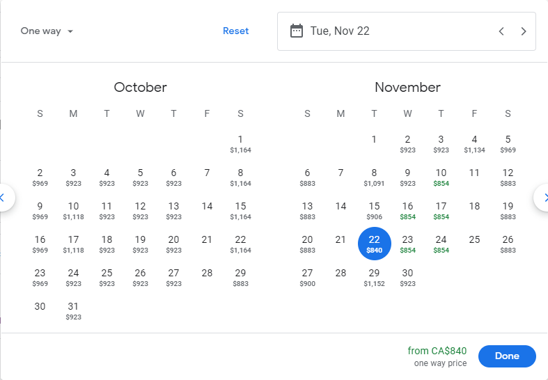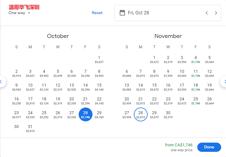 目前从温哥华单程直飞香港的价格都维持到1000加币以内,11月最低价格是$840。
