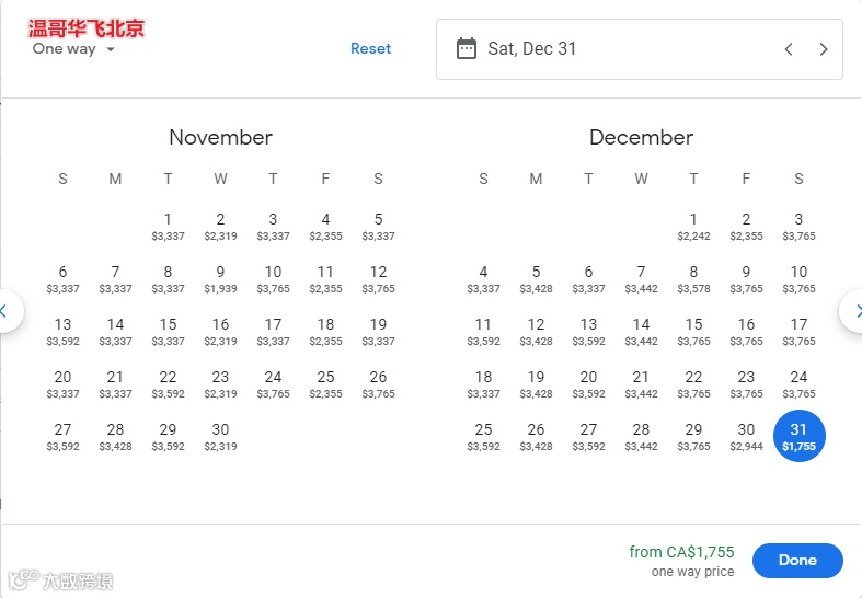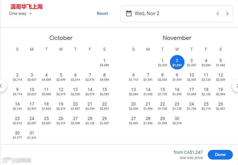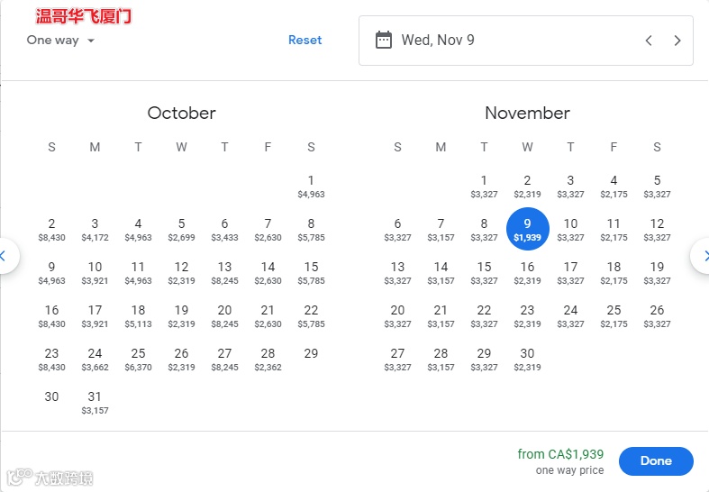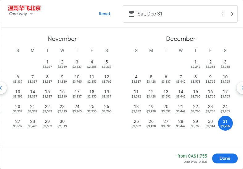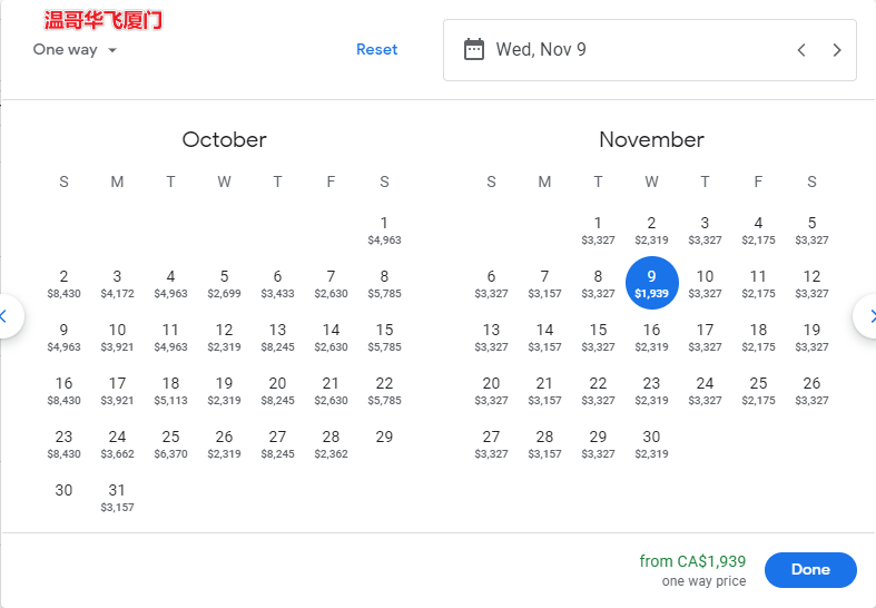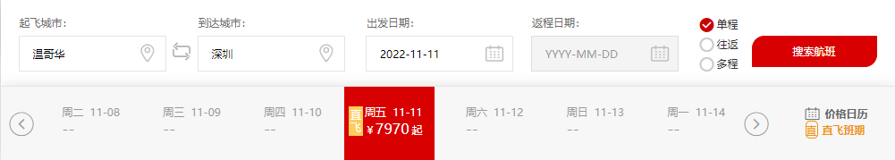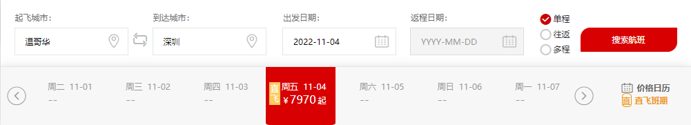 甚至出现了¥7970的单程直飞票价,折合加币1500左右,是11月4号与11月11号的海南航空!
