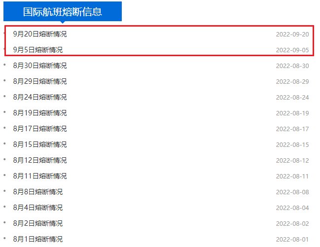 9月到目前为止,中国民航局只发过两次更新,分别是9月5日和9月20日,涉及航线8条,熔断班次10班。