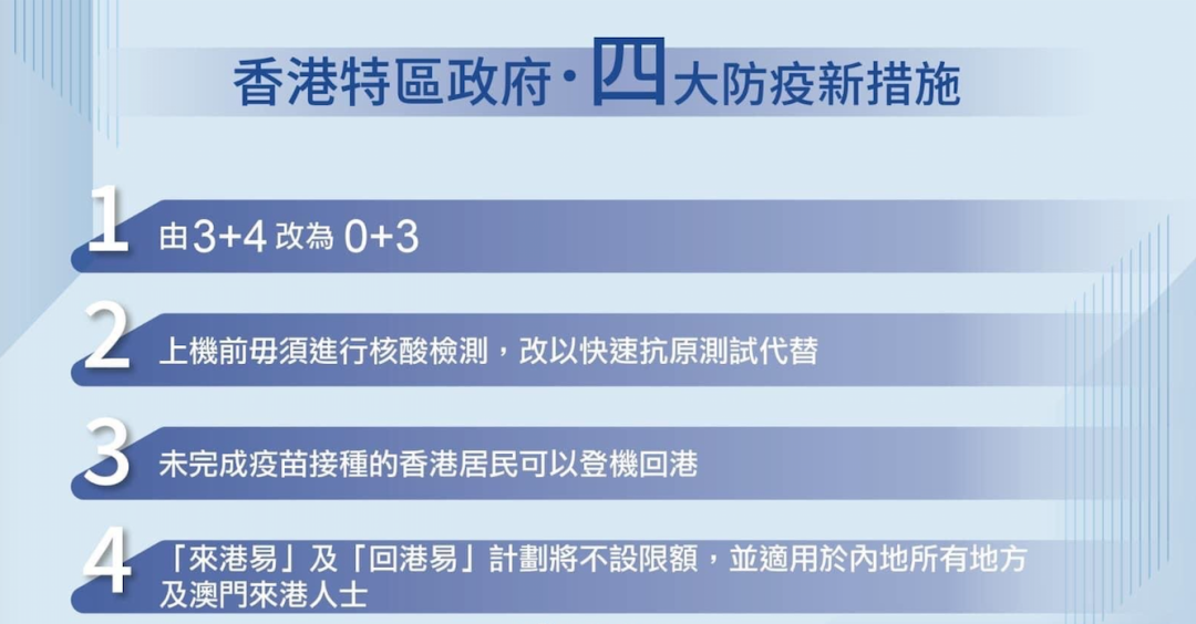 取消未接种疫苗人士不能赴港的限制:未接种疫苗的香港居民可返港,但抵港后要完成疫苗接种;
