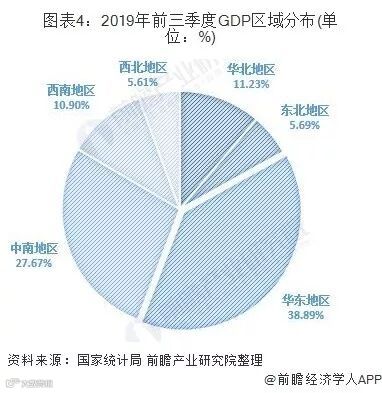 从2019年前三季度GDP的区域分布来看,华东地区和东南地区的GDP总量占据了全国GDP总量的大头,其中华东地区的GDP占全国的38.89%,中南地区的GDP占据了全国的27.67%。