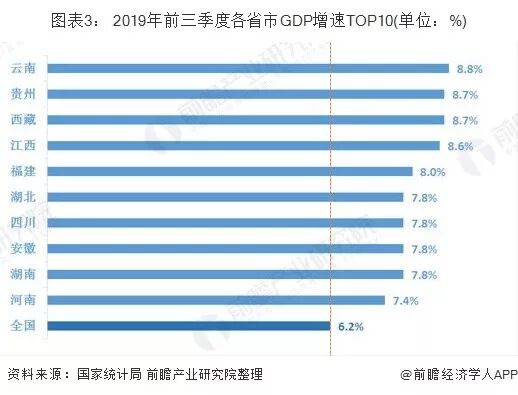从2019年前三季度各省市GDP增速来看,云南省以8.8%的增速占据了榜首,超出全国水平2.6个百分点,贵州与西藏紧随其后,其GDP实际增长率均达到了8.7%。