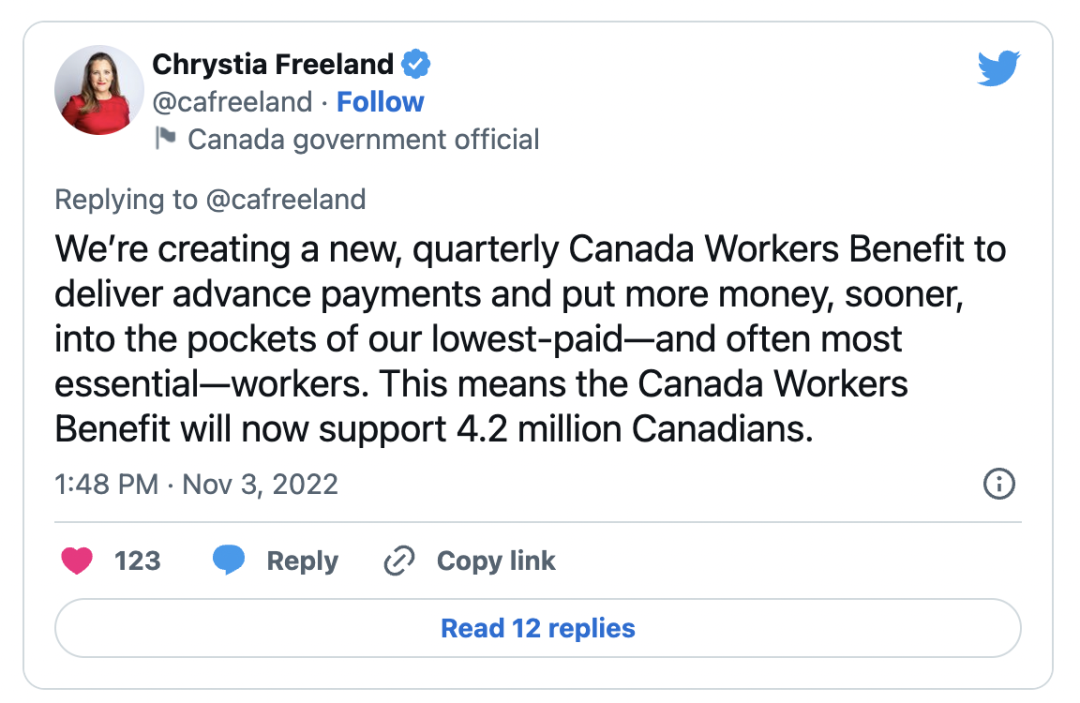 方慧兰在Twitter上表示:“我们正在创建一个新的、按季度发放的加拿大工人福利金,以提供预付款,并将更多的钱更快地投入到我们工资最低——往往也是最重要的——工人的口袋里。”