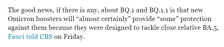 当XBB和BQ.1.1同样能逃避抗体和某种抗体治疗时,福奇也放出过“好消息”——针对Omicron的二价疫苗,“几乎肯定”能提供“一些保护”。