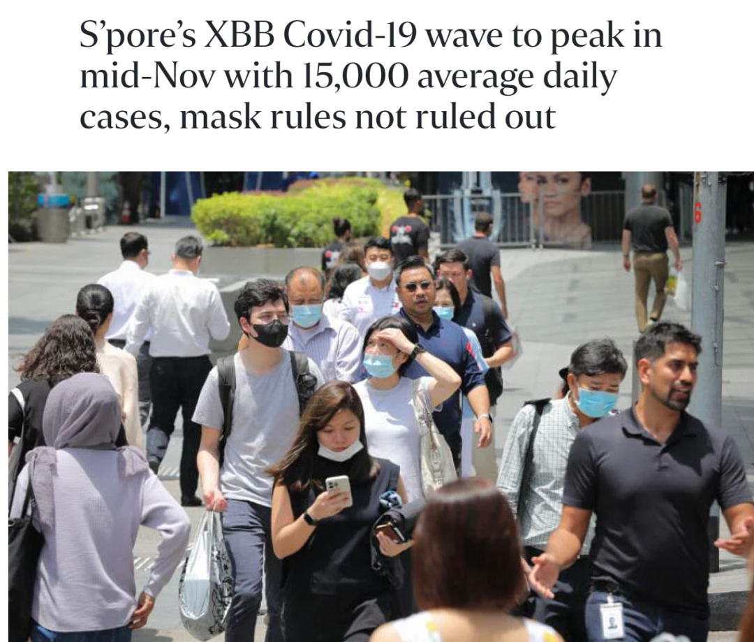 XBB的威力在新加坡体现得最淋漓尽致——它在一天之内让新加坡的日增从4700例飙升到了11700例。卫生部预计,到11月中,XBB驱动的这波浪潮将导致日增高达1.5万例。