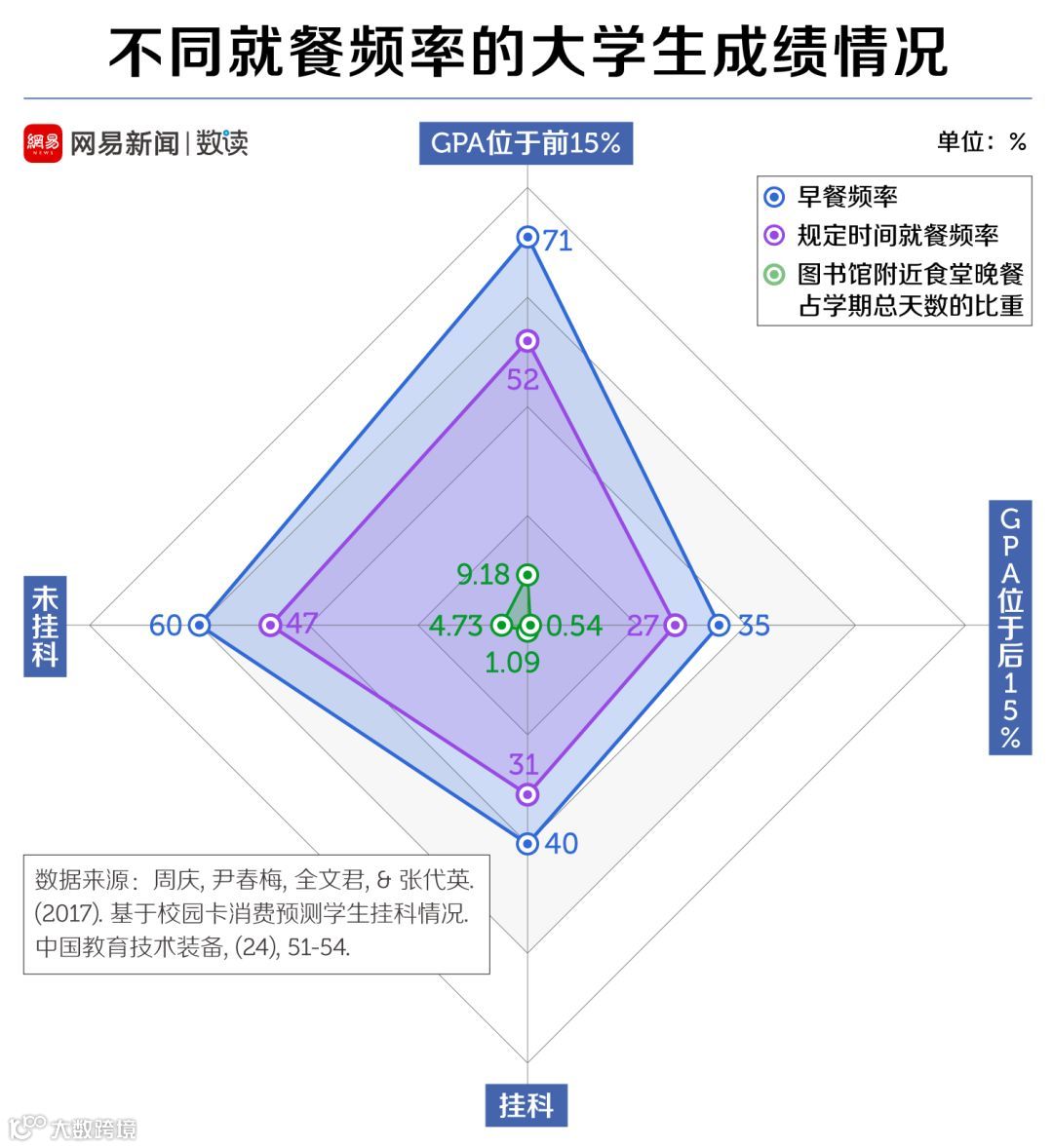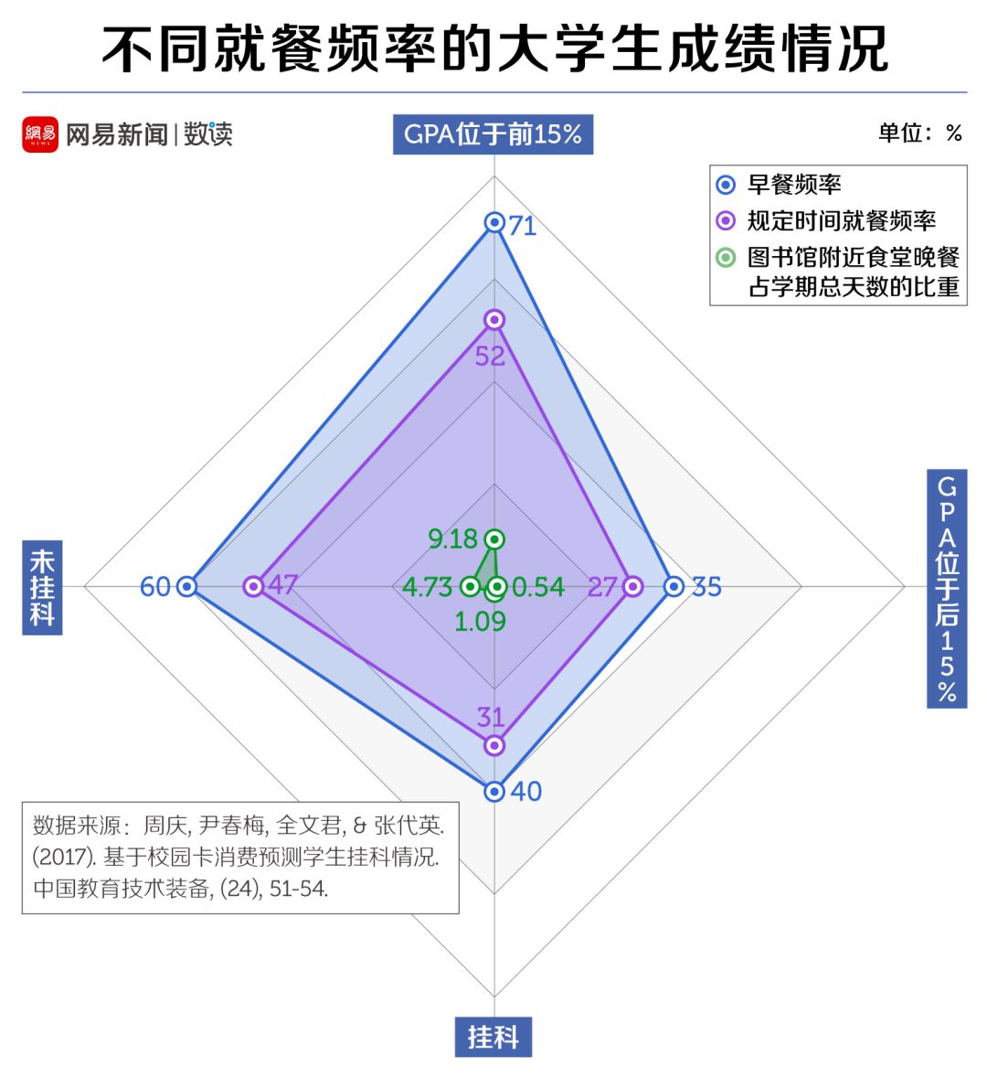 从数据来看,成绩平均绩点前15%以及未挂科的学生在图书馆附近食堂就餐的频率、吃早餐的频率以及在规定时间就餐的频率,都要高于成绩平均绩点后15%以及挂科的学生。