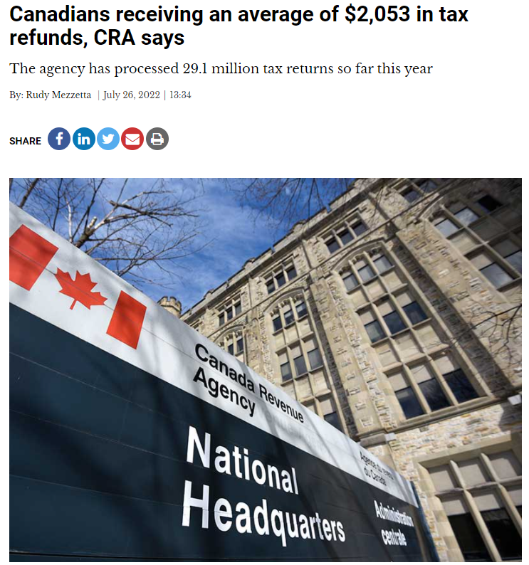 到目前为止,CRA在2022年税收季节已经处理了2,910万份申报表,其中有1,690万份处于需要退税的状态,总额为347亿加元。