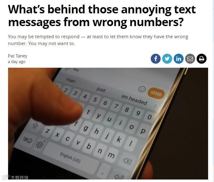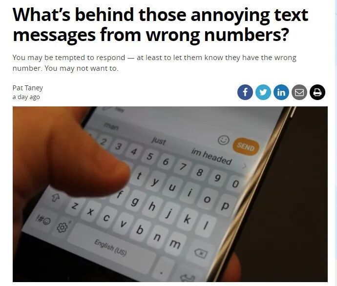 你是否曾收到过陌生人发来的短信,要么提醒你晚餐约会迟到了,要么提醒你商务会议迟到了等等,很多时候,短信里提到的名字并不是你的,你也知道这类短信可能是发错了,大多数加拿大人可能会礼貌地回复,告诉对方发错了。事实上你这个小的举动已经朝对方的陷阱迈进了一步。专家提醒,这些发错的短信十有八九是骗子干的,要马上将其拉黑,不要做任何回复。