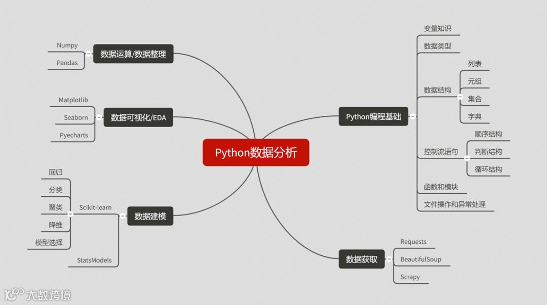 是否具备编程能力,是初级数据分析和高级数据分析的风水岭。数据挖掘、BI、爬虫、可视化报表都需要用到编程。以下以python介绍语言学习的路径: