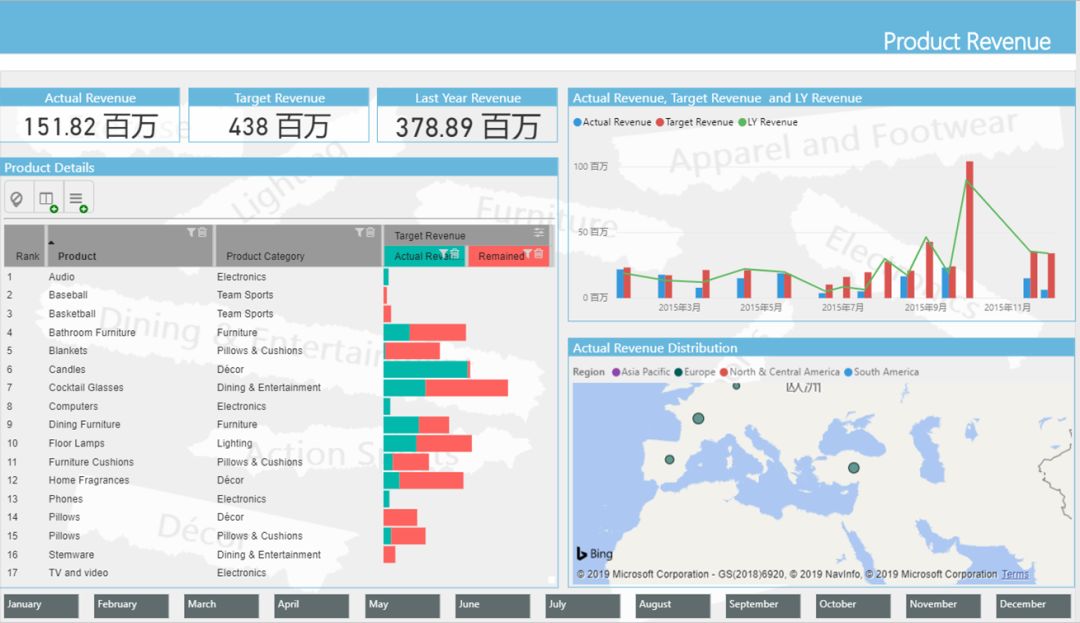 数据可视化不仅是一门技术,也是一门艺术,同样的数据在不同人的手中,展现出来的效果会千差万别,掌握这门技术会成为职场的加分项。可视化的工具有很多,这里我推荐微软的Power BI或者Tableau。这两款都不要编程功底,实现起来简单,功能强大。下图是Power BI工作的示例:(产品销售报表)