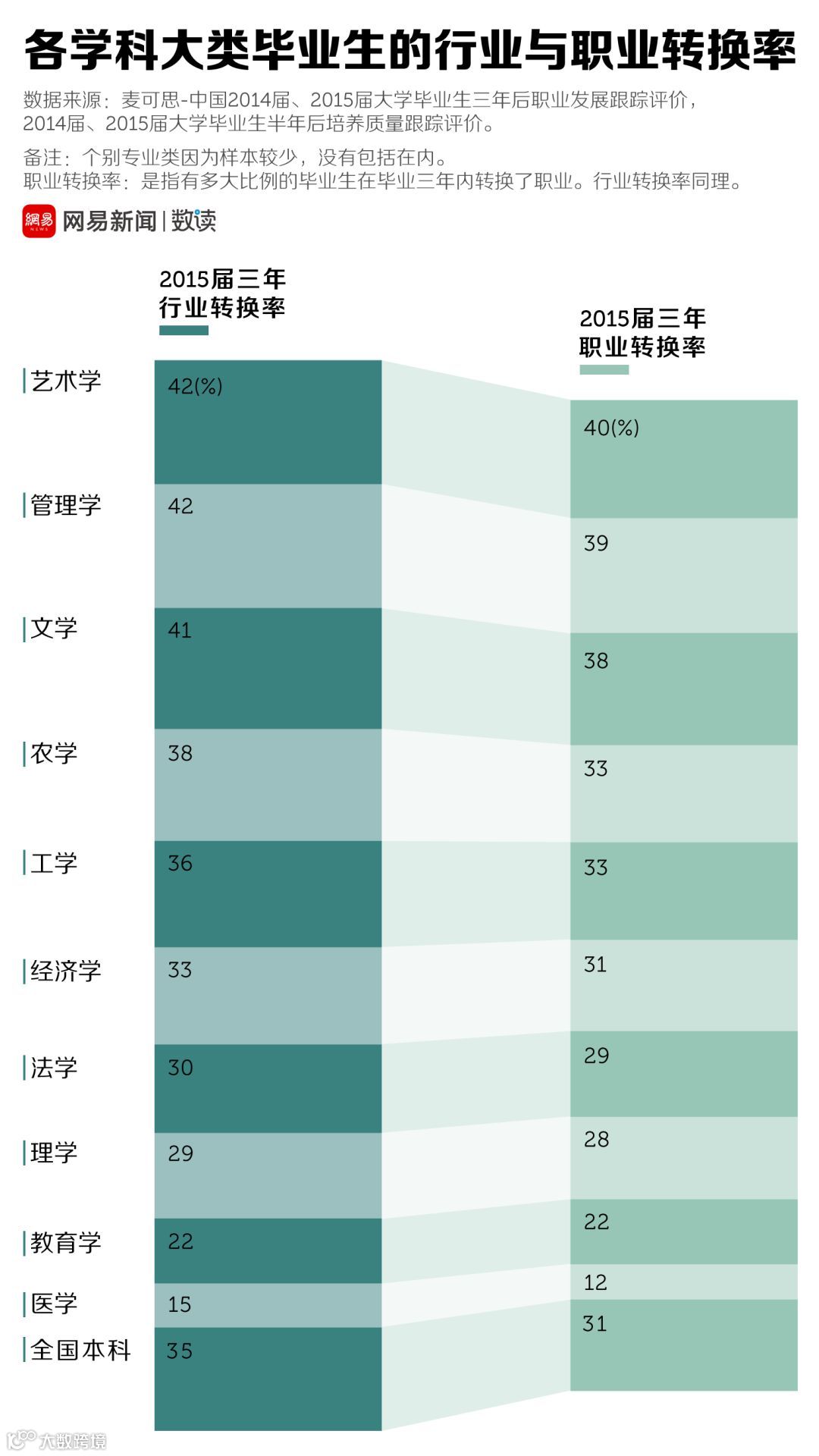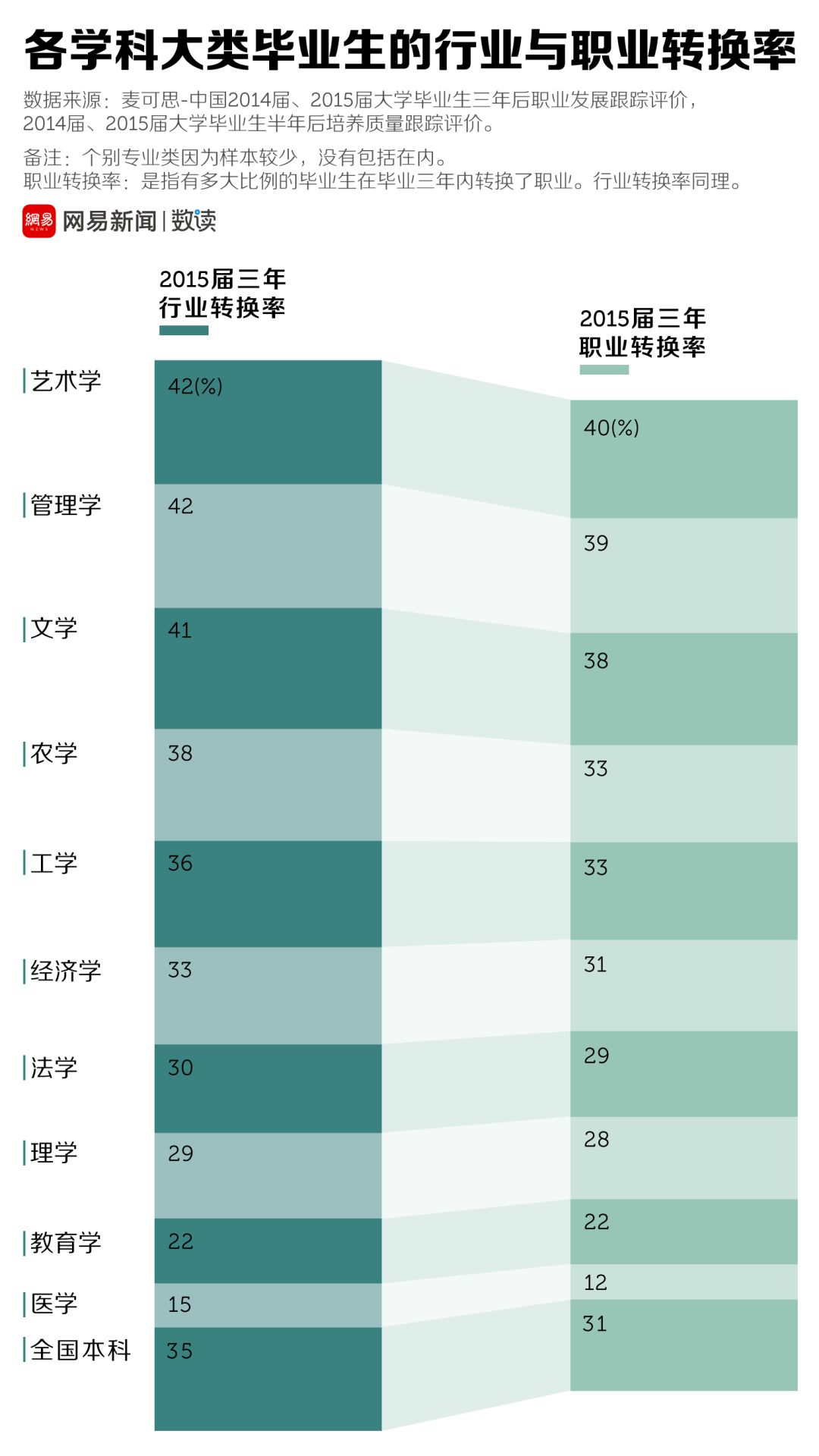 其中,艺术学、管理学与文学的毕业生,有约四成会在三年内转换职业。当然,这其中的大多数人,是直接“转行”。